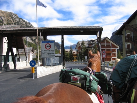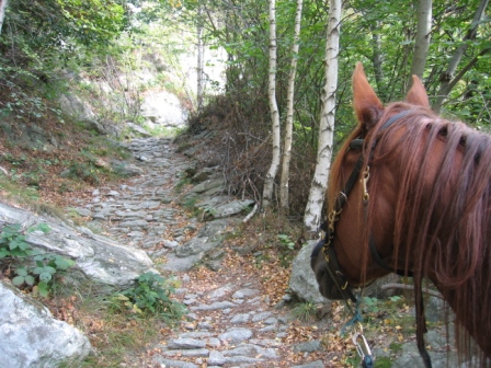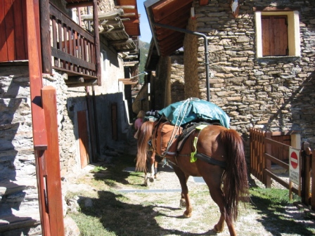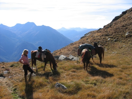 quarter of an hour to We followed a series of valleys (Chisone, Susa, Viu) and crossed the passes between them (Sestriere ~2000m, Orsiera~2500m, Colombardo~1900m). The views of alpine peaks from the passes were magnificent: south west to Monte Viso, north west to the Vanoise, north to the Gran Paradiso. We continued to bivouac most nights but a couple of times, camping at 2000m we woke to find the water buckets frozen and we had to give the horses more grazing time in the day to compensate for poorer grass at night.