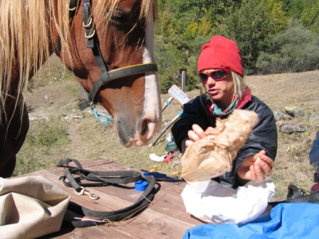 We rested for a few days with Antonietta and Dario and couldn't have found anyone nicer, friendlier or more helpful. We slept in five star comfort on the top floor of their lovely house, our first bed since the bunk on the ferry over from Plymouth. Everything was washed, everything repaired, modifications made to equipment. We talked for hours about everything, especially all aspects of horse travel. Always riding from home, they've done long trips all over Europe, including one to Russia and the Baltic Sea. They knew exactly how they could help us the most and they did. Maps, addresses of good places in Slovenia and Hungary, a reconnaissance mission to check out the first day's ride into Slovenia. We couldn't believe how lucky we were to have met them and found we had many other things in common besides the horses. Three thousand seven hundred horse kilometres from Llandeilo, we were made to feel at home: mountain pictures on the walls, Bob and Bruce on the CD player.
