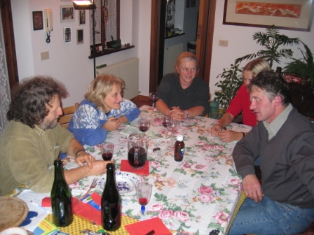 We were treated to outstanding hospitality at our nights' stops. The men were always called something ending in 'o': Georgio, Enzo, Claudio, Marco, Emilio, Mauro, Piero, Artemio etc. We always offered to pay but were rarely allowed to. And the meals! So many big evening meals, often with a few relatives invited round, lots of talking, some shouting so people could be heard above all the talking, and always lots of vino. I think the food sequence in peoples' homes along the Po went pizza, pasta, pasta, pasta, pizza, spaghetti (complete with eating lesson for me), pasta, pasta, pasta. The horses ate well too. We found good hay and good hard feed nearly everywhere. This, together with the good grass along the 'argine' meant that the horses put on weight and were well fuelled for some good canters along the river banks.