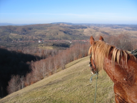 us to stay awake. It was Having established where we were from and where we were going, he just looked bemused. “Haven’t you got a car? “ He asked “Not even a cart ?” In Hungary more people had started to ask why we were doing this trip, but the Romanians just wanted to know why we didn’t go by car. If we had, it would have stood out a mile from all the Dacia 1310s. No need for What Car magazine here, no agonising choices to be made. It seems that you can have a Dacia 1310 and that is it. As we climbed into the foothills of the Carpathians, there were more and more flocks of sheep, it was just like home except here they still have shepherds…. and dogs. The shepherds made no attempt to stop these dogs from barking and biting at our heels and hooves. We tried to explain that a flick from one of Hannah’s hinds could leave their dog with a nasty headache, but to no avail. Still, at least the live dogs didn’t smell as bad as the dead ones. After what had seemed like for ever on the plain, we were now finally back in the mountains. The higher Transylvanian peaks to the East were plastered in snow, a beautiful sight but one that left us wondering how we’d get through. How were we to know which tracks would be passable, which would we be buried in snow? There were big road routes, but, as always, we wanted to keep off the asphalt.