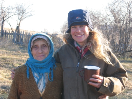 likely to be able to afford to invest sufficiently to meet new EU In Ciresu we stopped for a few days to give the horses a mini break. In the village shop I asked for “laptea” (milk). “Nu Nu Nu” went the shouts accompanied by wagging fingers from the men assembled inside drinking beer, “Natural natural natural !” who on earth would spend cash on something you just get from your cow? Half an hour later, a girl brought a plastic bottle of milk up to our tent on some communal land high above the village. Later on, others came with cheese, eggs, jam and onions. We wondered how Romanians would be treated, camped on a common outside a British village? Inadvertently, we’d found ourselves copying this habit of repeating words. Maybe it helps to reduce the length of gaps in conversation when your language skills are as limited as ours. Luckily Romanian is quite similar to Italian and we were grateful for the words we’d picked up back in the Autumn. We were surprised to find quite a few French speakers too. It seems that French along with Russian used to be taught in some schools. We used French with a man in Poiana who said he hadn’t spoken it since he left school 20 years ago. He was a real star, offering us our first bath for you-don’t-want-to-know-how-long. Later on, Lisa went to the village dance with his lovely daughters, Maria and Nicoletta. My